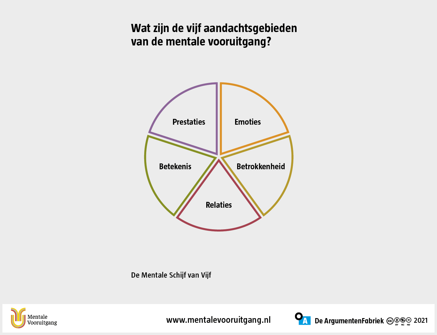 Mentale vooruitgang is het voortdurend verbeteren van onze mentale toestand. Het is de groei van de mentale kracht van personen, gezinnen, organisaties en samenleving. Met behulp van de Mentale Schijf van Vijf beschrijven we hoe we onze samenleving mentaal sterker kunnen maken: gelukkiger, meer betrokken, socialer, betekenisvoller én daadkrachtiger.